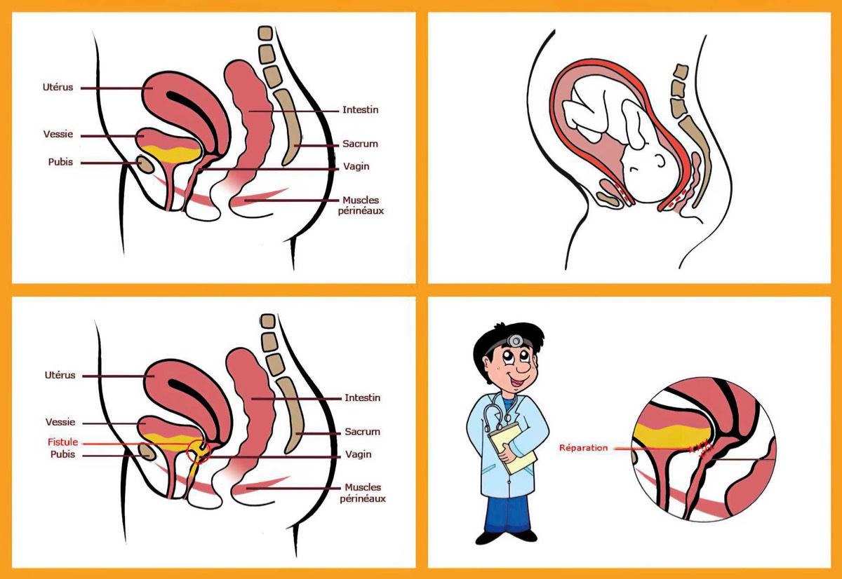 La tête du fœtus, bloquée dans la filière génitale trop étroite, comprime les tissus du vagin, de la vessie et/ou du rectum, empêchant leur oxygénation par le sang, ce qui provoque leur mort. À la tombée des tissus nécrosés, un trou se forme : la fistule. Les femmes ont alors un écoulement permanent d’urines (incontinence urinaire totale permanente) et parfois de selles par le vagin. La plupart du temps le fœtus ne survit pas.